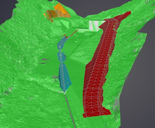 点群データ上に設計線形を反映させることで、現況地形との位置関係を視覚的に確認することが可能となり、施工前段階での干渉チェックや施工範囲の把握を容易に行うことができます。